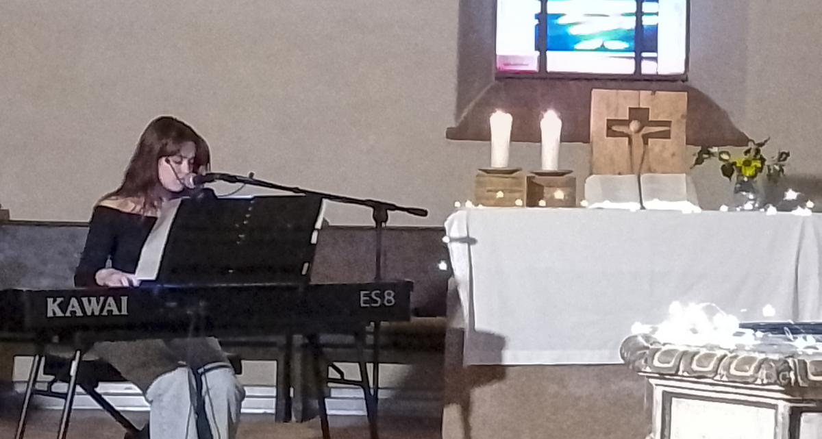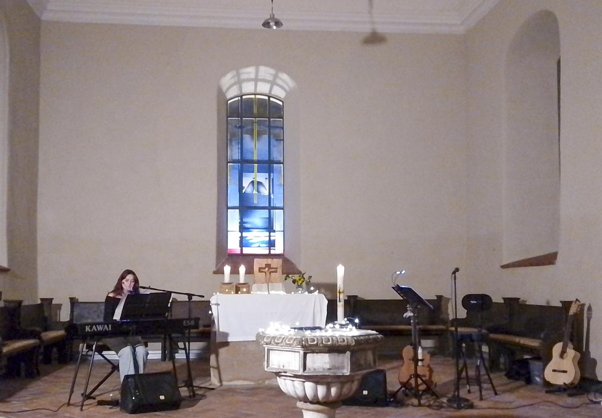 Die Kirche St. Petrus im halleschen Stadtteil Wörmlitz bot noch wenig bekannten Künstler*innen, wie Kaja Gorys aus Bernburg, eine Bühne. Vor den Farben des Petrus-Fensters sang sie ein eigenes, gefühlvolles Lied.