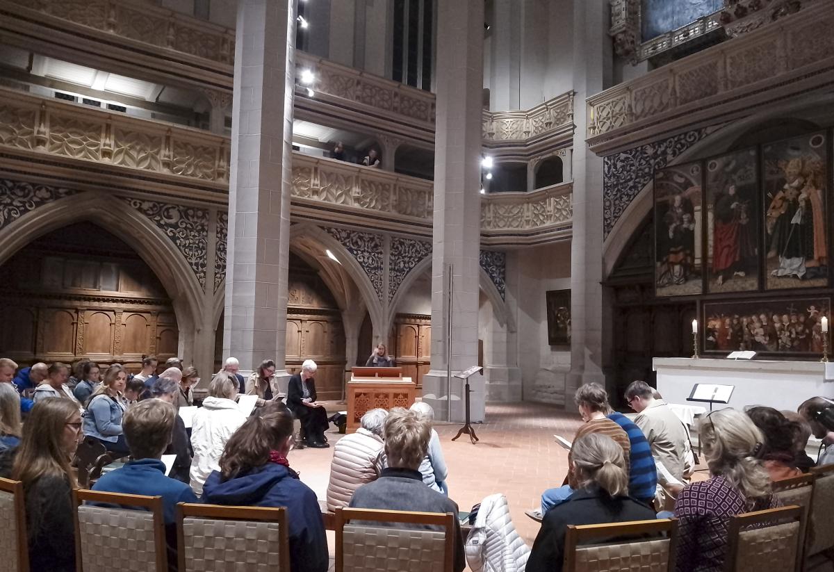 In der Marktkirche lud Kantorin Anna Scholl in den Altarraum ein, um mit Gästen - die auch aus Baden-Württemberg und Bayern kamen - christliche Abendlieder zu singen. Selbst ein Kanon war im Gotteshaus zu hören. Passend zum diesjährigen Motto der NDK hat die Marktkantorin das Lied „Eine Brücke lasst uns bauen" ausgesucht.