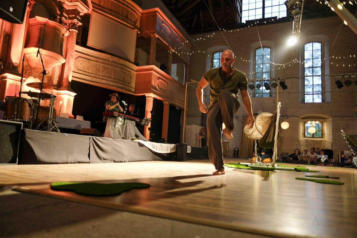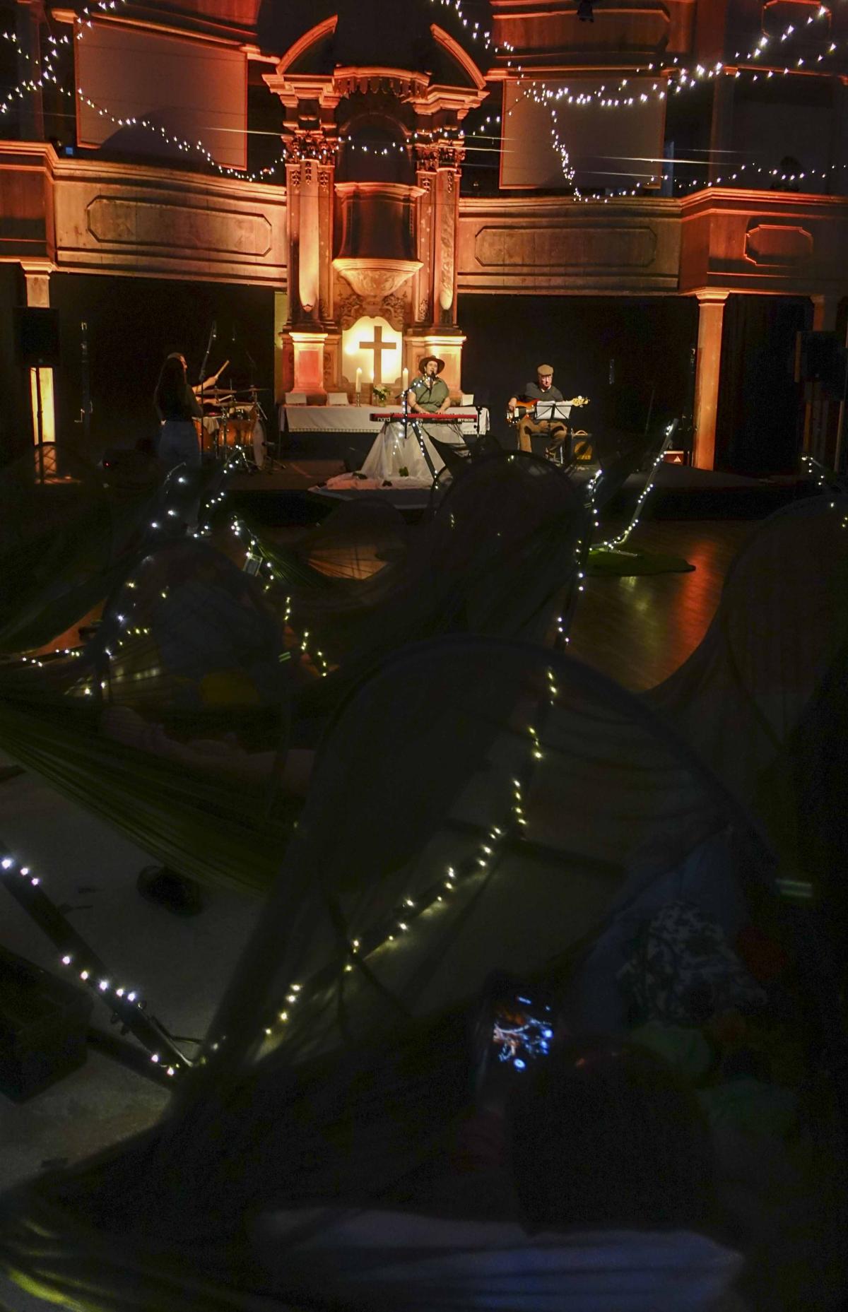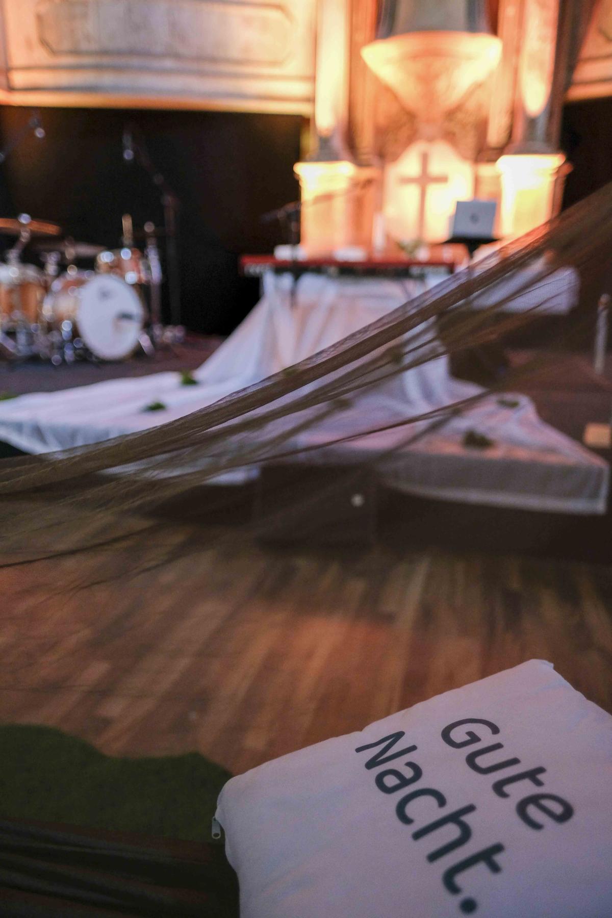 Während in Holleben die nächtlichen Pilgerinnen und Pilgern Lidele in Jiddisch zu Gehör bekamen, waren die Gäste in der halleschen Georgenkirche auf der Suche nach lauschigen und bequemen Plätzen. Die dort beheimatete Evangeliumsgemeinde hatte zu einem „Schlafkonzert“ eingeladen. Ein Meer von Outdoor-Hängematten füllte den Raum und verlangte den Nutzerinnen und Nutzern bei deren Besteigen einiges an Gewandtheit ab. Böden und Sitzecken waren mit Kissen und Matratzen ausgelegt, so dass auch alle diejenigen, die nicht in den Genuss einer Hängematte kamen, ihr Haupt ruhig betten konnten. Eine Tanzperformance markierte den Anfang des „Schlafkonzertes“. Der weitere Verlauf war dann zu Beginn schwungvoll. Allmählich wurde der Rhythmus der Musik langsamer bevor nur noch eine sphärische Klangflächen im Raum lagen. Diese Ruhe übertrug sich auch auf die Besucherinnen und Besucher, die mit ruhiger werdender Musik von Morpheus Reich umschlungen worden. Nach ca. 20 Minuten steigerte sich der Rhythmus wieder, was allenthalben zu einem sanften Erwachen im Kirchraum führte.