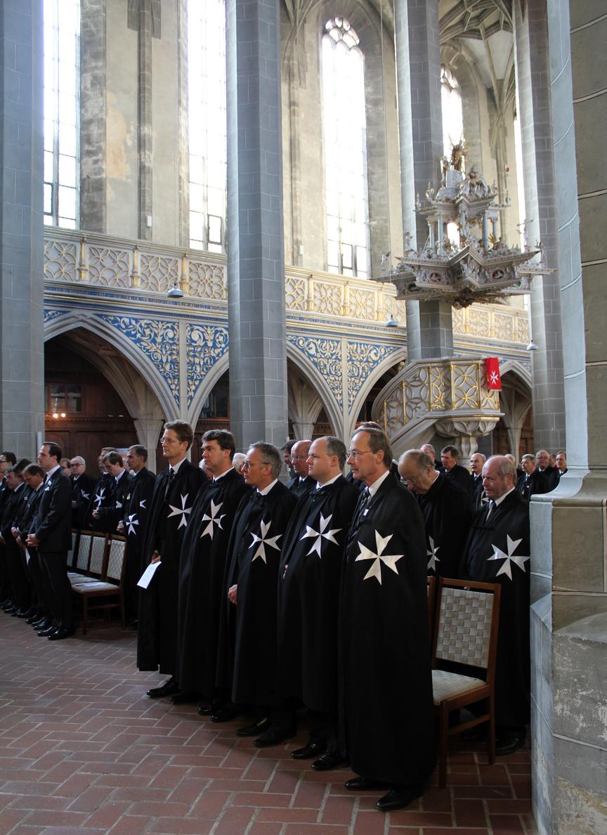 Die Besucherinnen und Besucher des sonntäglichen Gottesdienstes in der Marktkirche durften am 25.09.2011 einer nicht alltäglichen Zeremonie beiwohnen. Die Provinzial-Sächsische Genossenschaft des Johanniterordens feierte an diesem Tag zusammen mit der Marktgemeinde den Festgottesdienst im Rahmen ihres Rittertages. Insbesondere der Einzug der ritterlichen Teilnehmer in ihren schwarzen Umhängen mit dem weißen Johanniterkreutz war ein erhebender Moment. Die musikalische Leitung unterlag dem Kantor Irénée Peyrot und Superintendent Hans-Jürgen Kant zeichnete sich für die Liturgie verantwortlich. Der Rittertag ist das jährliche Treffen der Ordensangehörigen in ihren jeweiligen Genossenschaften. Die Provinzial-Sächsische Genossenschaft ist regional für die Bundesländer Sachsen-Anhalt und Thüringen zuständig. Aus diesem Grund hält sie ihre Rittertage abwechselnd in je einem der beiden Länder, in immer wechselnden Städten ab. Dieses Jahr traf sie sich in Halle an der Saale.
