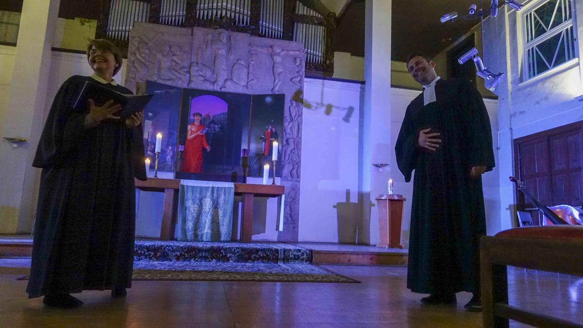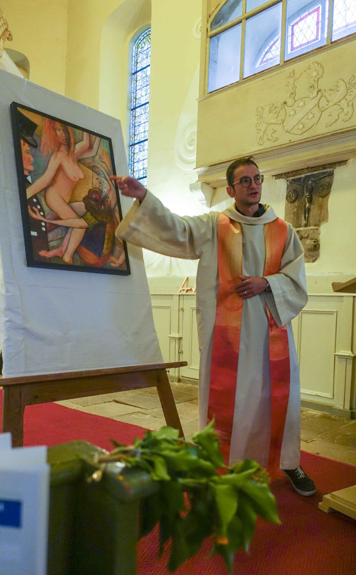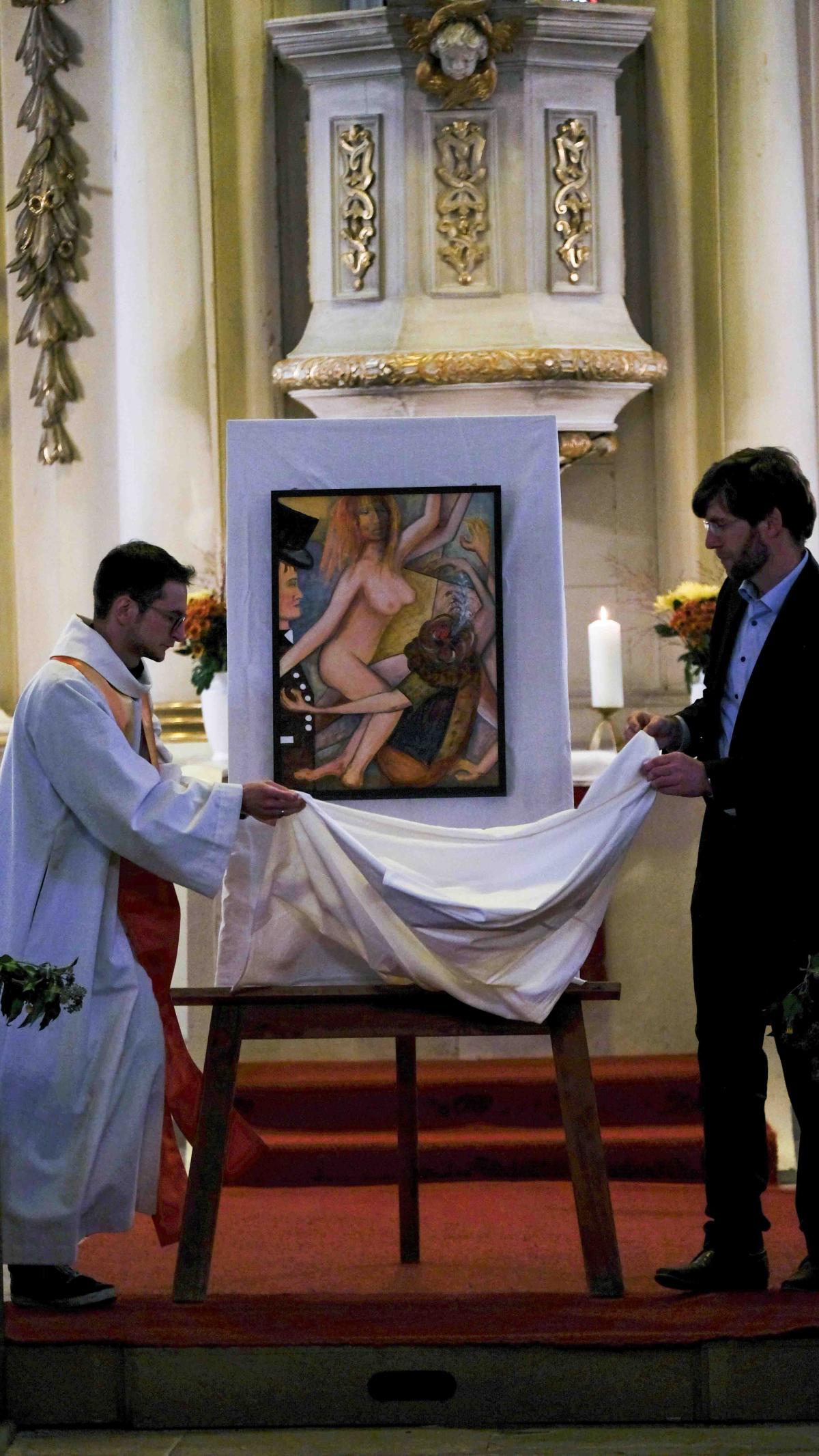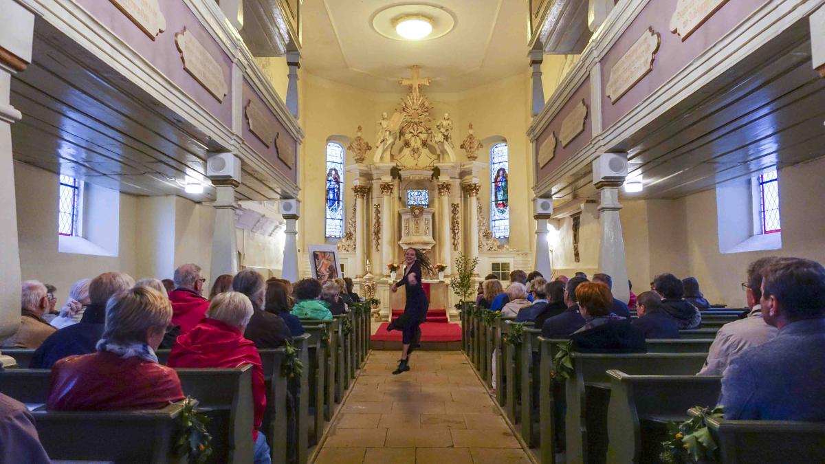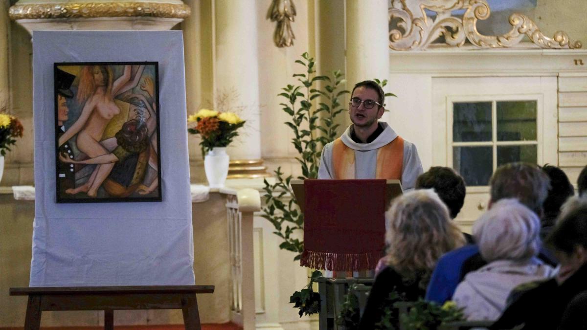 Ein herausfordernder und zugleich lebendiger Rahmen, den Pfarrer Meyknecht - teilweise gemeinsam mit seiner Gemeinde - füllte. Besonders bemerkenswert war seine, als Bildinterpretation angelegte Predigt (hier nachzuhören oder zum Nachlesen). In dieser zeichnete der Seelsorger seine Vorstellung von Ewigkeit. Dabei hielt er Rückgriff auf ein – sicherlich für manch eine(n) auch provokantes – Bild der Eislebener Künstlerin Wiltrud Eber. Seine philosophisch-naturwissenschaftlich geprägten Betrachtungen changierten zwischen entrücktem Tanz und distanzierter Betrachtung, zwischen der Suche nach Ewigkeitsmomenten, welche die Zeit im Jetzt und Hier anhalten, und sachbezogene Diskussionen um Strukturen und organisationale Selbstverwaltung. Es braucht beides, betont der Seelsorger und träumt zugleich „von einer Kirche, die sich [wieder mehr] traut zu tanzen.“