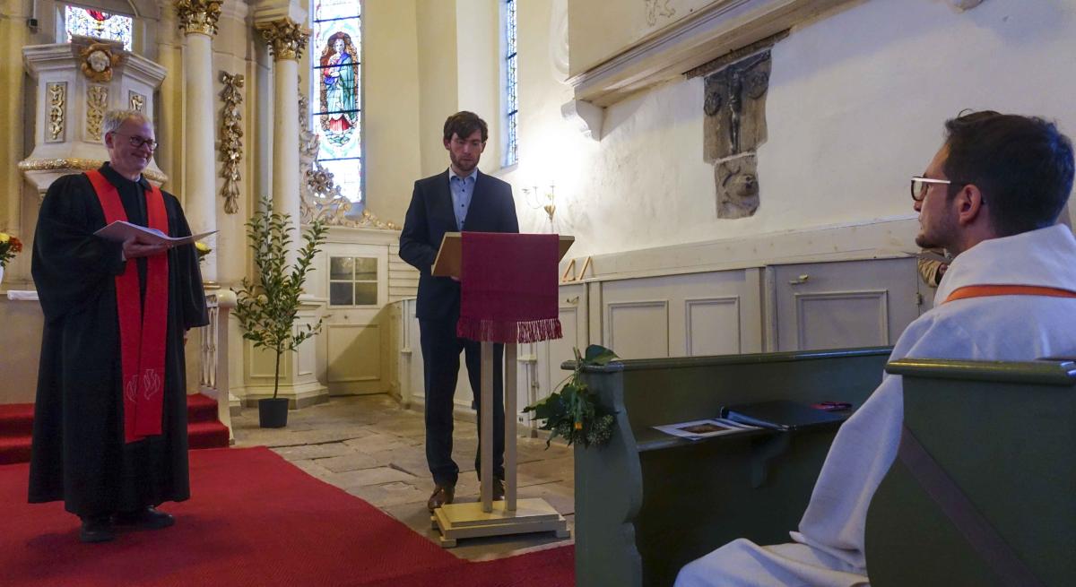 Gestern wurde der promovierte Theologe nun im Bürgerhaus Christuskirche von Kirchenrätin Katharina Passolt offiziell in sein landeskirchliches Pfarramt für Studierenden- und Hochschulseelsorge in Halle (Saale) inkl. einer Beauftragung für Merseburg eingeführt.
