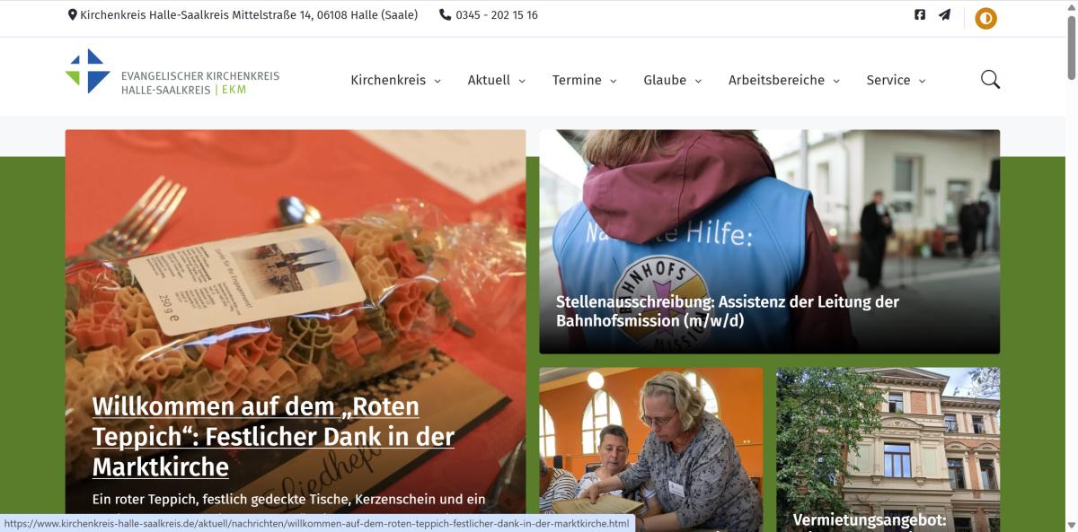 Seit gestern ist die neue Website des Kirchenkreises online. Es gibt noch die eine oder andere Nacharbeit, die umgesetzt werden muss, aber ein großes Stück des Weges ist bereits zurückgelegt. Dabei nutzen wir das frisch überholte Webseiten-Layout der EKM.