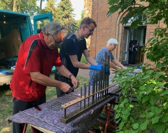 Dank finanzieller Unterstützung vieler Spenderinnen und Spender sowie einer Förderzusage aus dem Orgelfonds der Evangelischen Kirche in Mitteldeutschland lässt sich die Sanierung nun endlich umsetzen. Am 1. August hat die Mitteldeutsche Orgelbau A. Voigt GmbH aus Bad Liebenwerda die Arbeit aufgenommen. Mit Unterstützung von Gemeindegliedern wurde das Instrument fachgerecht zerlegt und in Teilen abtransportiert. Parallel zu Reinigung und Verschleißbeseitigung sollen aus klanglichen und optischen Gründen auch die Pfeifen wieder in originaler Mensur und aus Zinn gefertigt werden.