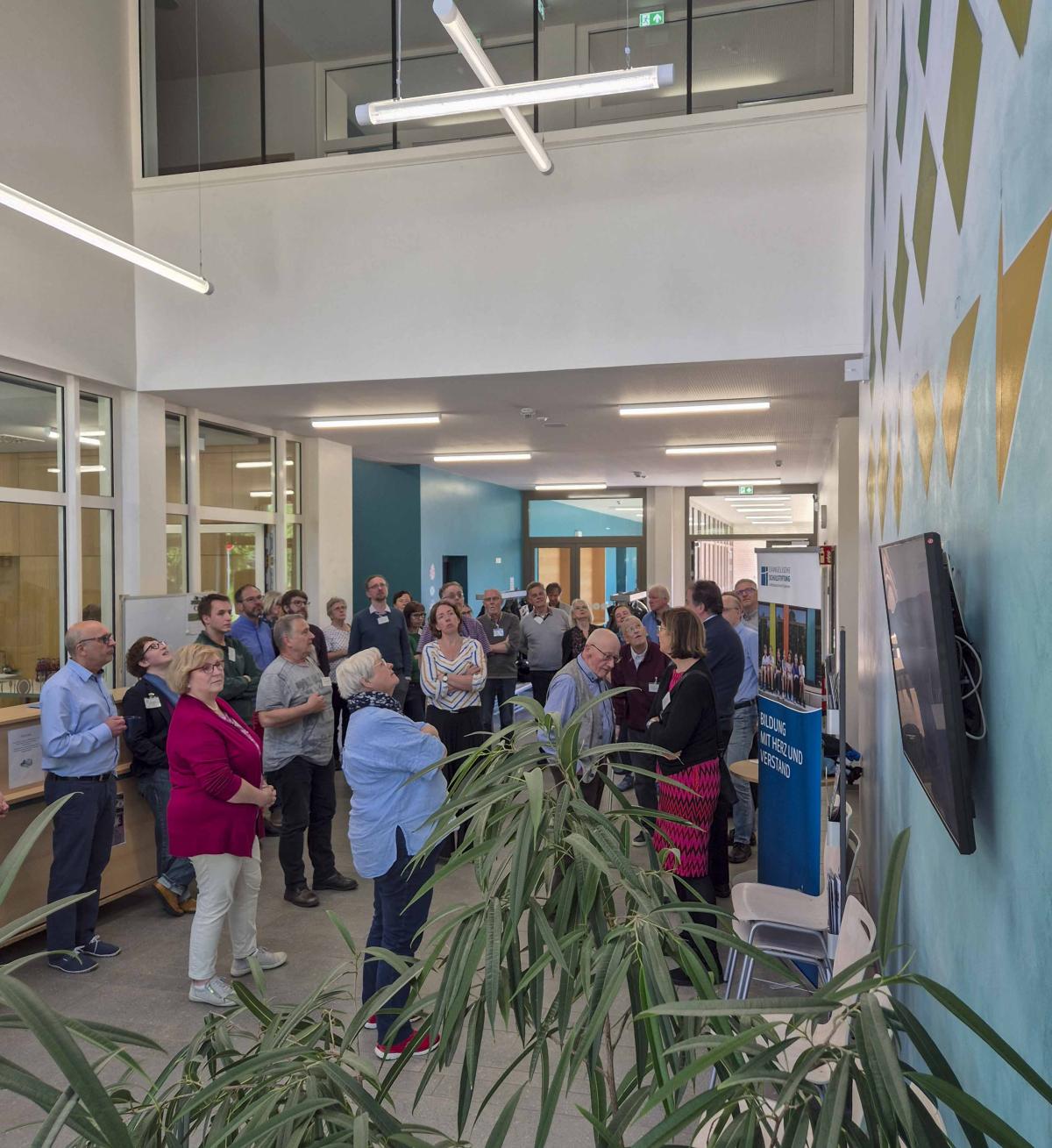 Nach der Morgenandacht veränderte sich die Blickrichtung der rund 40 Synodalen buchstäblich: Das Präsidium hatte seinen Platz an der großen Glasfront vis-a-vis des leuchtenden Kreuzes eingenommen. Dort wartete auch Elisabeth Lauterbach, stellvertretende Leiterin der Schule, und begrüßte als Gastgeberin die Anwesenden herzlich in der Schul-Kantine – einem der „Top 4 Lieblingsorte“ der Kinder.