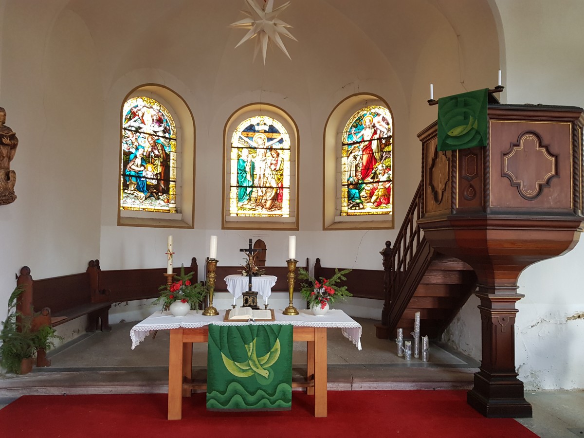 - Besonderheiten: - drei Buntglasfenster mit Szenen aus dem Leben Jesu von der Naumburger Glaswerkstatt Wilhelm Franke aus dem Jahr 1901