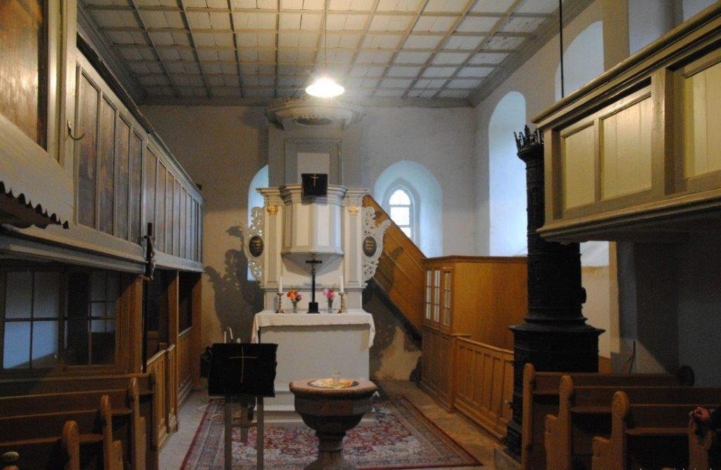 Im Inneren zeigt St.Helena eine recht schlichte barocke Ausstattung mit Kanzelaltar. Jener wird von zwei Säulen flankiert und ist mit geschnitzten floralen Wangen verziert, welche zwei Zierkartuschen tragen, in denen die Abendmahlsworte "Nehmet hin und esset" und "Nehmet hin und trinket" zu lesen sind. Die umlaufende U-förmige Empore, die den Innenraum umschließt, ist auf der Nordseite in ihren Feldern mit Gemälden verziert, welche biblische Szenen, beginnend mit Jakob und der Himmelsleiter bis hin zum Pfingstfest zeigen. Die Südseite ist unverziert.Bemerkenswert ist weiterhin die heute weiß getünchte Kassettendecke, die den Innenraum überspannt.