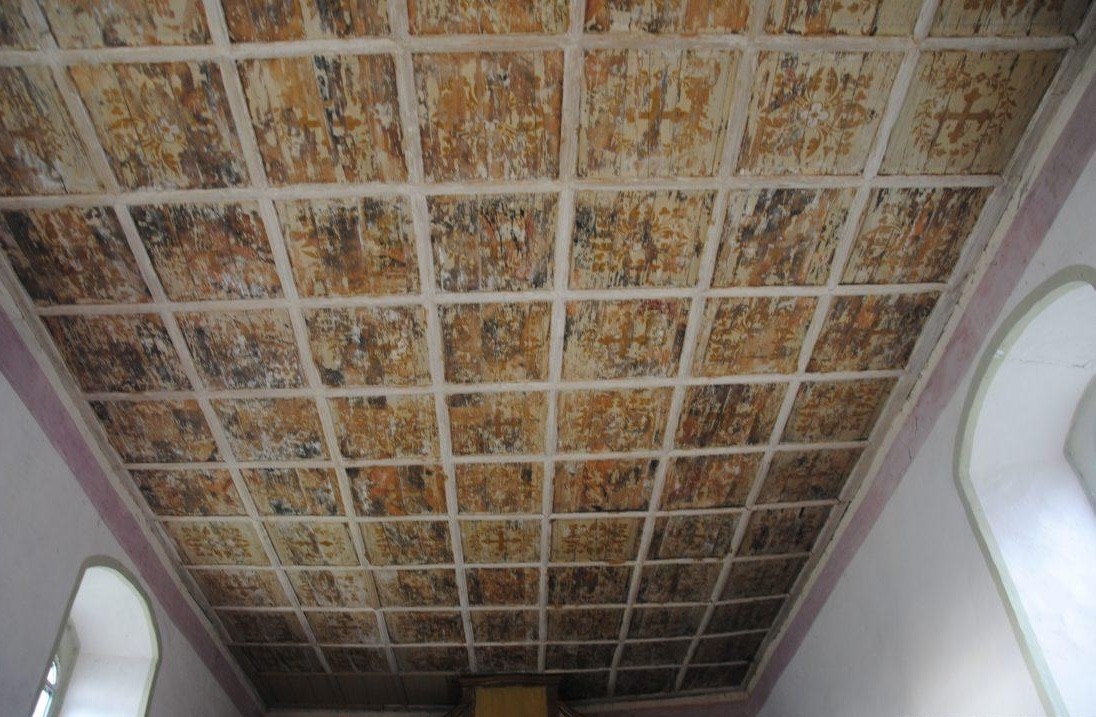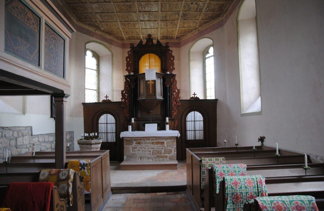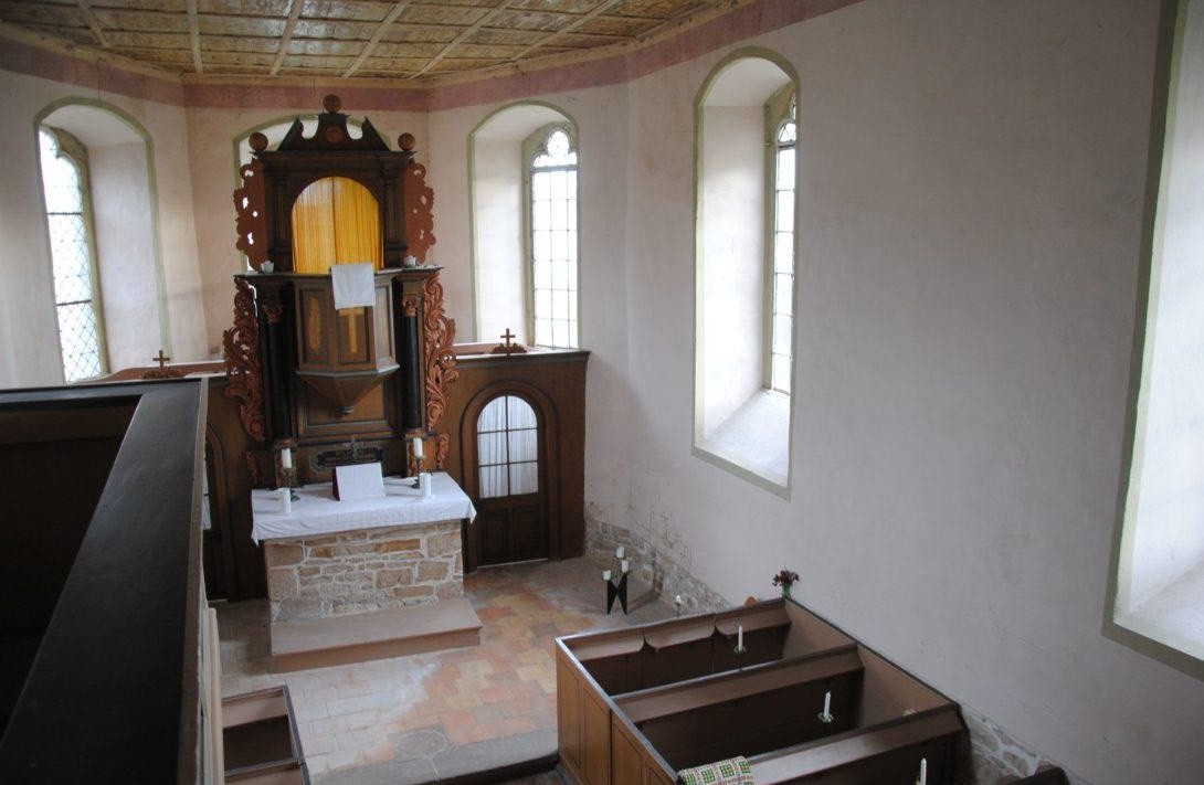 Das helle Innere zeigt sich schlicht. Eine Kassettendecke aus Holz, deren einzelne Felder einstmals kunstvoll bemalt waren und heute beschädigt und unkenntlich über den Verfall der Kirche berichten, überspannt den Raum. Unterhalb umrahmt ein roter Zierstreifen das Mauerwerk. Die Fensternischen sind durch schmale farbige Bänder abgesetzt. Im Jahre 1613 erfolgte ein weiterer Umbau u.a. auch der Einbau eines Renaissanceportals an der Südseite. Der schlichte Altar aus der 1. Hälfte des 18. Jahrhunderts steht hinter einem gemauerten Altartisch mit massiver Altarplatte. Der Kanzelkorb wird von dezenten floralen Schnitzwangen und niedrigen Säulen umrahmt, deren korinthische Kapitelle mit der Oberkannte des polygonalen, schlichten Kanzelkorbes abschließen, dessen Felder mit zwei gemalten Ähren und einem Kreuz verziert sind. Bekrönt wird der schlichte Altar von einem torartigen Aufsatz, der gleichsam den Durchgang zum Kanzelkorb bildet mit aufgemalten Säulen und einem ausschwingenden Giebel mit Zierkugeln. In der Predella befindet sich eine Zierkartusche mit einem Bibelwort - die rotbraune Farbfassung des Altars ist mit Sicherheit nicht als original anzusehen, fügt sich jedoch angenehm in den Raum ein. Die Empore aus der 1. Hälfte des 18. Jahrhunderts umläuft L-förmig den Raum und umschließt West- und Nordseite. Ihre rechteckigen Flachfelder sind mit Kreuzblumen, floraler Malerei und Spruchbändern mit geometrischen Mustern verziert. Schmale, schlichte Säulen tragen die Empore. Das Taufbecken aus dem Jahre 1613 ist im Gegensatz zum Rest der Kirche sehr reich verziert. Dieses wurde 1909 umfassend erneuert. 1917 musste eine Glocke sowie die Prospektpfeifen der Orgel zu Rüstungszwecken abgegeben werden.