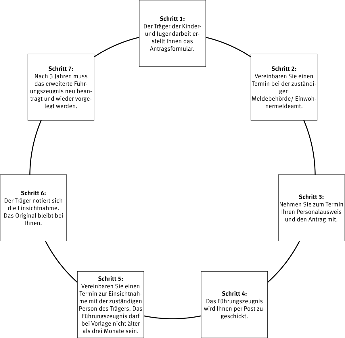 Die Vorlage des erweiterten Führungszeugnisses ist ein wichtiger Baustein der Präventionsarbeit. Sie verhindert, dass einschlägig vorbestrafte Personen beschäftigt werden und hat somit eine Signalfunktion. Personen, die Umgang mit Schutzbefohlenen und Zugang zu den Räumlichkeiten haben, legen zur Einsicht nach § 72 a SGB VIII ein erweitertes Führungszeugnis vor. (...)