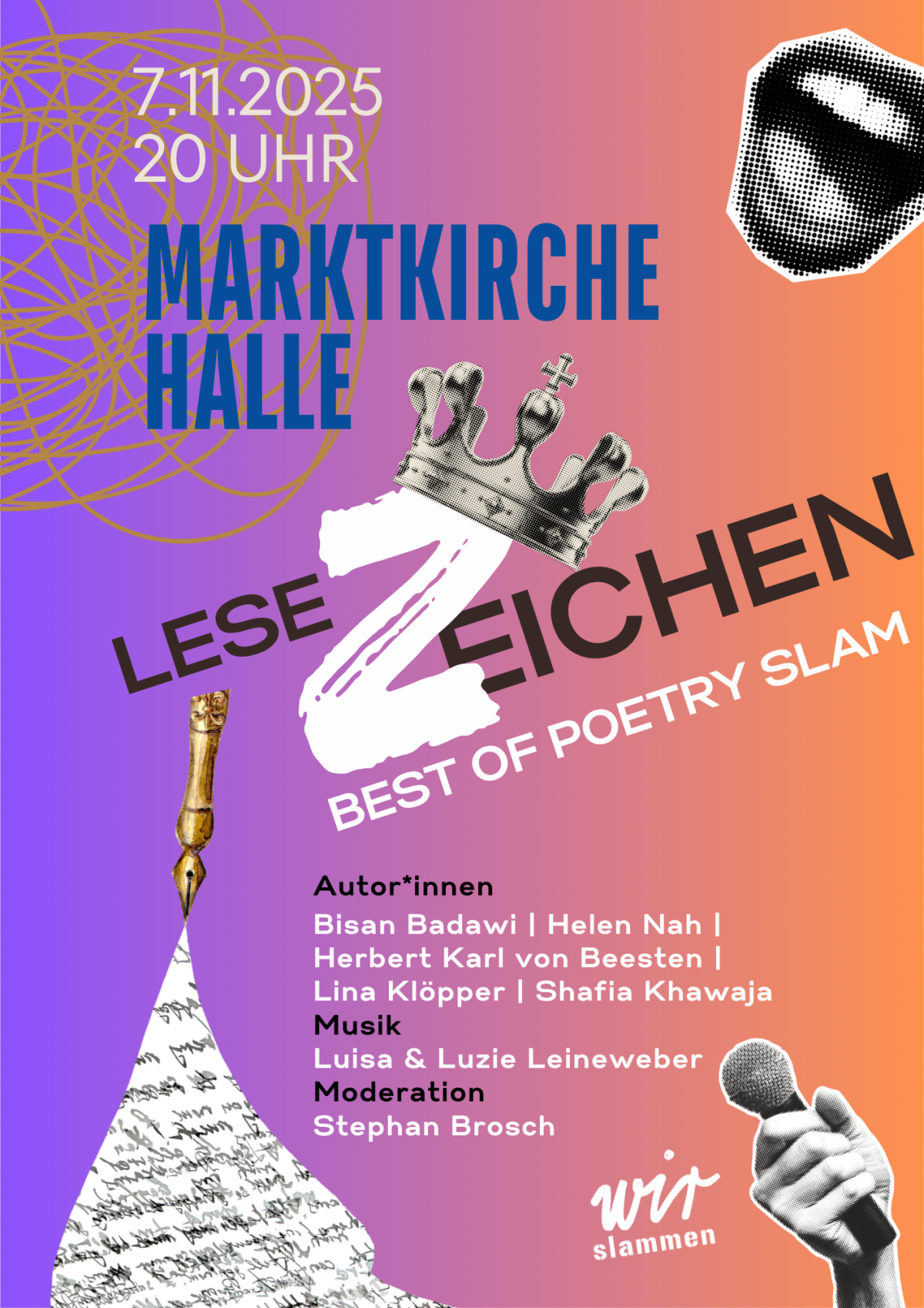 Lina Klöpper – Lina hat zwei Mal die sächsische Landesmeisterschaft gewonnen (2021 & 2022), stand im Finale der deutschsprachigen Meisterschaften und trinkt begeistert Kaffee. 2022 erschien Linas erstes Werk "Liebe und das Gegenteil“ im Brimborium Verlag - eine Sammlung queerer Kurzgeschichten und Gedichte.